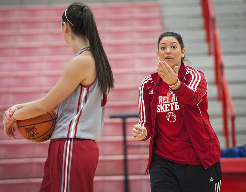 New Sacred Heart women’s basketball coach Jessica Mannetti works with a player during a recent practice. (Photo: Mark Conrad)