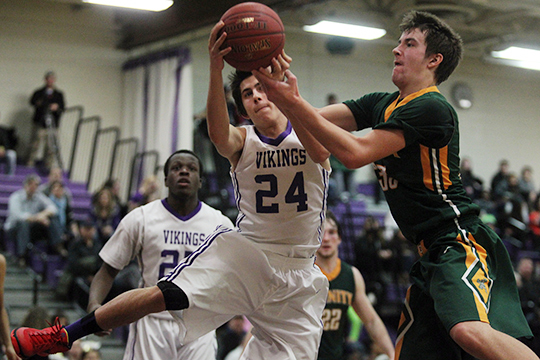 Trinity Catholic basketball captain Thomas Costigan tries to grab from a Viking opponent during the fourth quarter of their FCIAC basketball game Friday night at Westhill High School. Westhill won the game,69-65.
