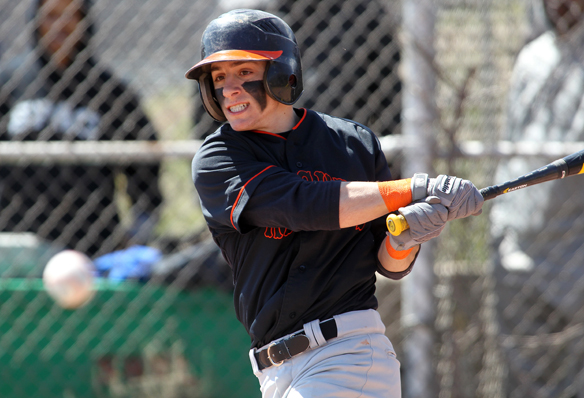 Stamford High School player (# 9 not listed on fciac roster) lashes a line drive hit during FCIAC baseball action against Trinity Catholic on Saturday afternoon. Stamford won the cross town regular season FCIAC game, 17-8.