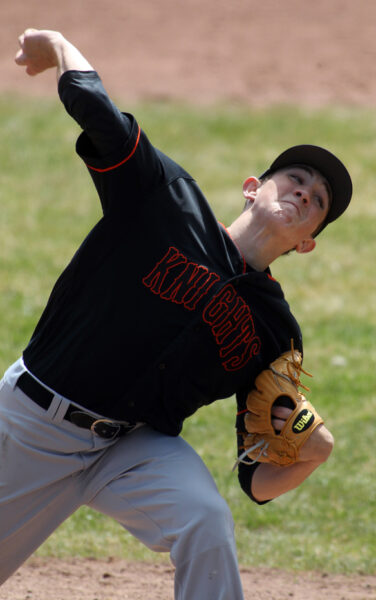 Stamford starting pitcher (no name on fciac roster) grimaces as he uncorks a pitch during FCIAC action against Trinity Catholic on Saturday afternoon. Stamford won the cross town game, 17-8.