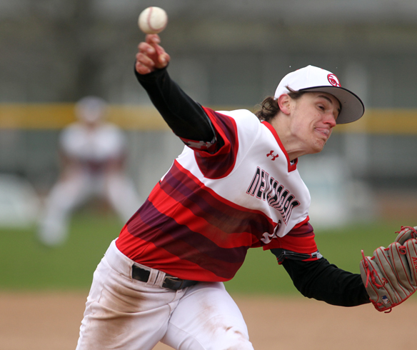 New Canaan pitcher ( # 44) uncorks a pitch during high school baseball action against Fairfield Warde on Friday. # 44 threw a complete game 3 hitter as New Canaan socked it to Warde, winning by a 6-0 tally.