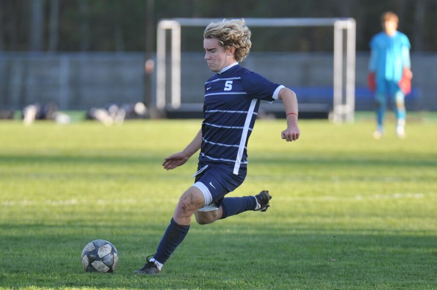 Alan Fiore of Staples hits a free kick.