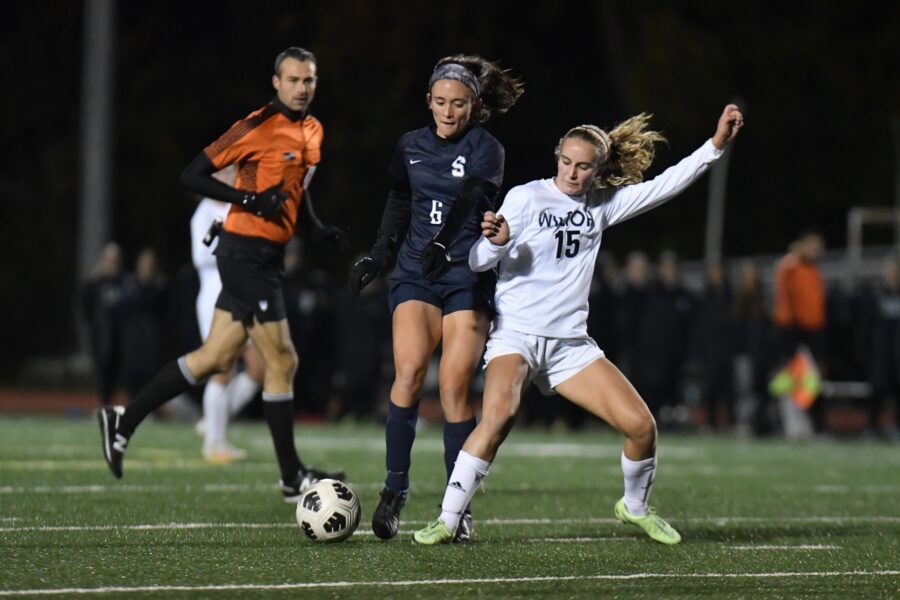 Courtlyn Crombie of Staples and Heather Plowright of Wilton play a 50/50 ball. Dave Ruden November 4, 2021 Leave a Comment