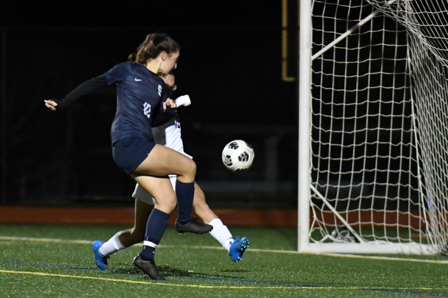 Madison Sansone of Staples scores the lone goal of the match against Wilton. Dave Ruden November 4, 2021 Leave a Comment