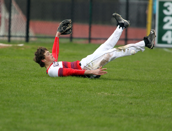 New Canaan leftfielder ( # 30) can’t come up with a fly ball hit in the gap during high school baseball FCIAC action against Fairfield Warde on Friday afternoon.