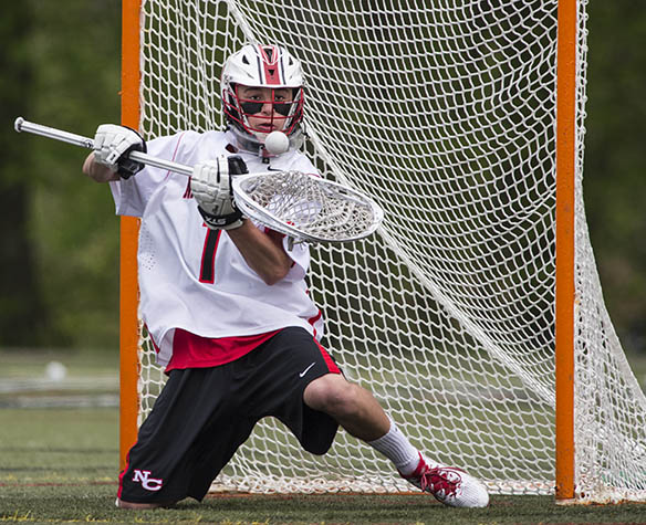 New Canaan high school goalie Drew Morris makes a save during a boys lacrosse game against Darien high school played at New Canaan high school, New Canaan, CT on Saturday, May, 9th, 2015.