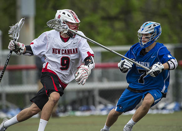 New Canaan high school’s Owen Toland tries to get by Darien high school’s William Simpson during a boys lacrosse game played at New Canaan high school, New Canaan, CT on Saturday, May, 9th, 2015.