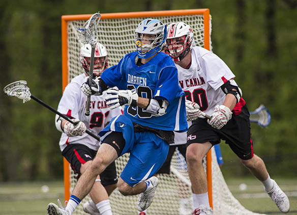 Darien high school’s Jack Book controls the ball in front of the New Canaan high school goal during a boys lacrosse game played at New Canaan high school, New Canaan, CT on Saturday, May, 9th, 2015.