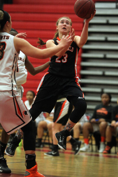 Ridgefield basketball player Jessica Camarda drives to the hoop for a layup during FCIAC quarterfinal basketball action against Stamford on Saturday. Ridgefield won the game to advance.