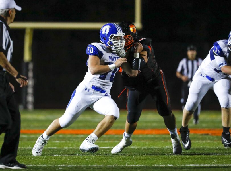 Darien’s Andrew Evanchick puts pressure on Ridgefield’s defense.