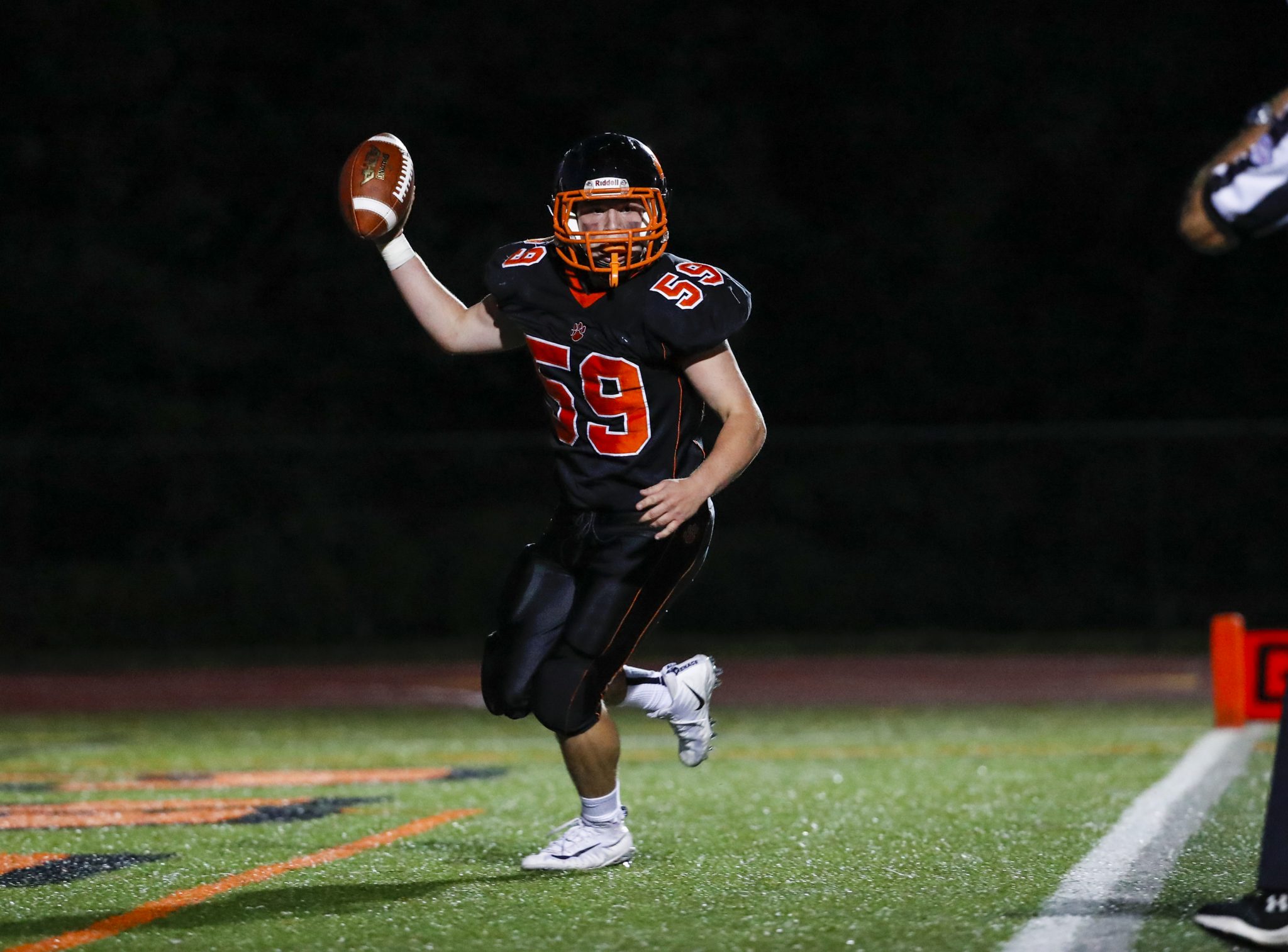 Ridgefield’s Connor Goff picks up a blocked punt for a touchdown. Dave Ruden September 8, 2017 Leave a Comment
