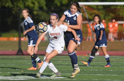 Ridgefield’s Gracie Girvalo controls in front of Wilton’s Andrea Benalcazar.