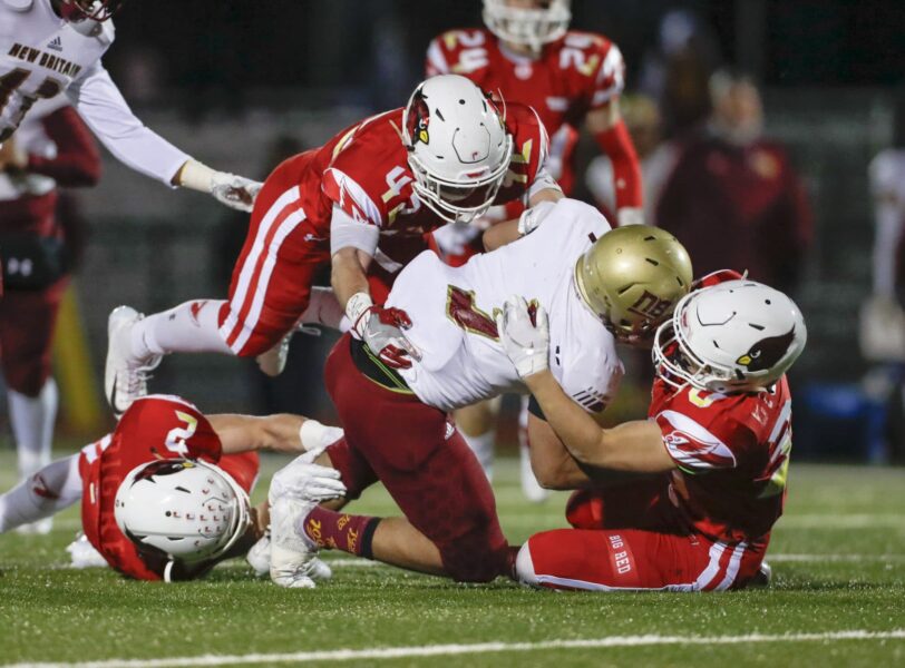 Greenwich’s Mozi Bici, Hunter Clark and Evan Weigold close in for a tackle. Dave Ruden November 27, 2018 Leave a Comment