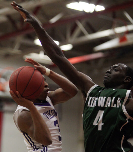 Norwalk forward Roy Kane Jr. goes high and hard on Westhill player CJ Donaldson during second half FCIAC boys championship action in Fairfield. Westhill won the closely battled game, 64-60.