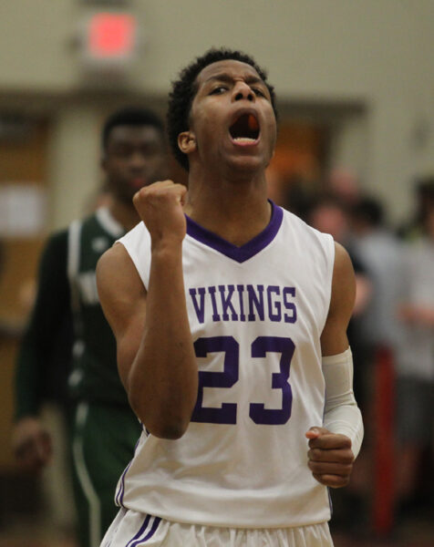 Westhill’s Juan DeLacruz lets out a triumphant yell seconds before the Westhill Vikings clinched the boys FCIAC basketball championship, 64-60 over Norwalk High School.