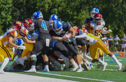 Mitchell Pryor (12) muscles his way into the endzone for Darien. Dave Ruden September 23, 2017 Leave a Comment