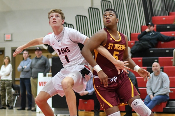 New Canaan’s Matt Brand and Kyren Jones of St. Joseph battle for position. Dave Ruden March 4, 2019 Leave a Comment