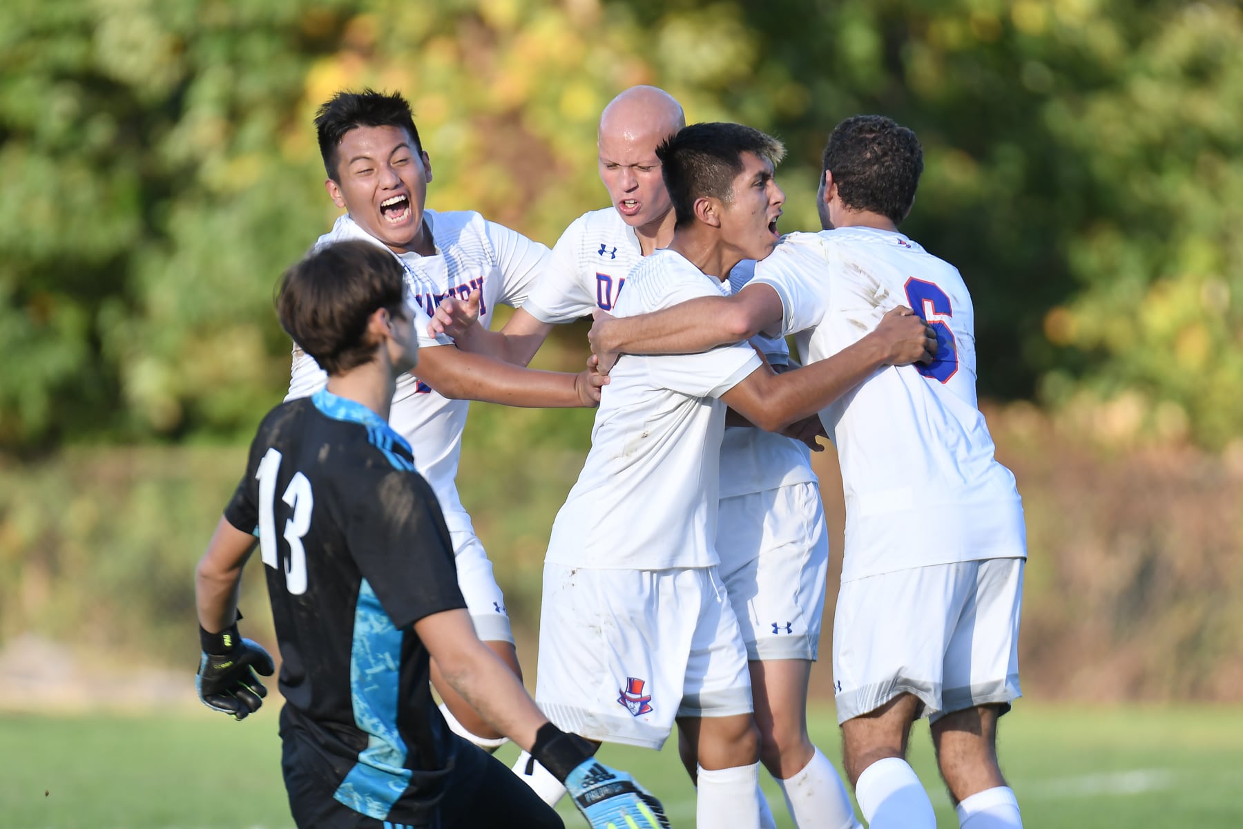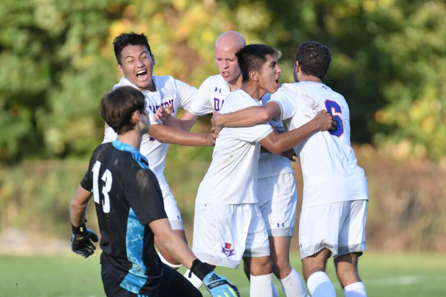 The Danbury Hatters celebrate a goal by Cristofer Carraasco.