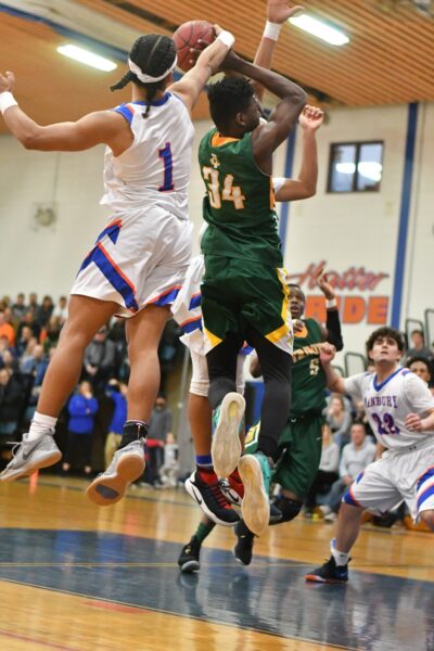 Danbury’s Diante Vines blocks a shot from Akim Joseph of Trinity. Dave Ruden March 10, 2018 Leave a Comment