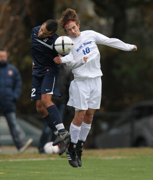 Graham Gudis of Staples and Darien’s Jack Kniffen battle for control of the ball during quarterfinal soccer action in Darien on Friday. Darien won the game , 2-0. © J. Gregory Raymond for Ruden Report