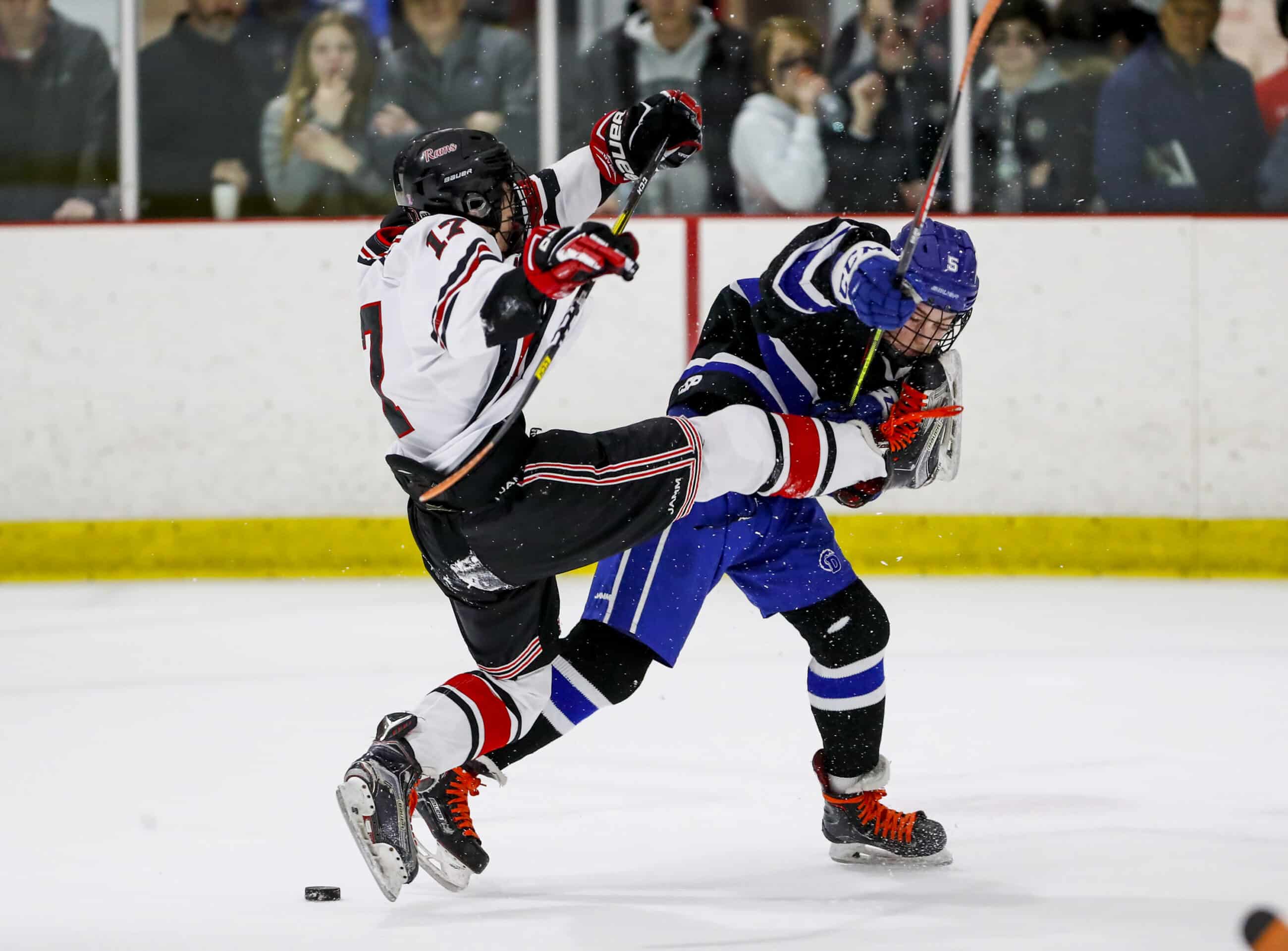 DarienÕs Teddy Dyer puts a hit on New CanaanÕs Justin Wietfeldt. Dave Ruden February 8, 2020 Leave a Comment