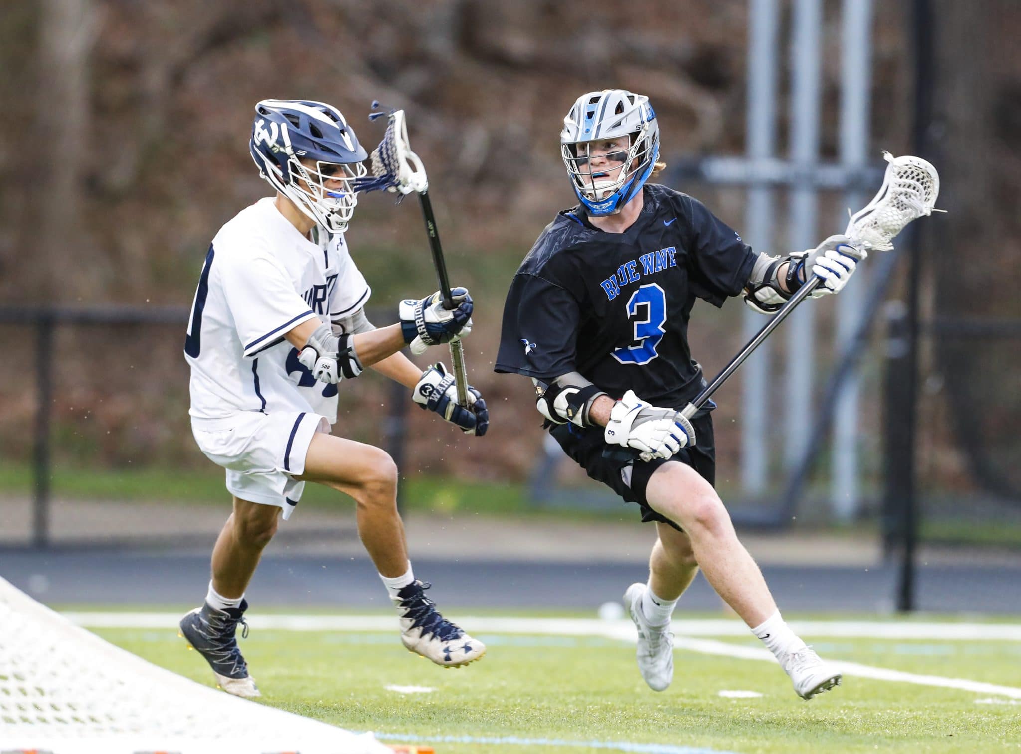 Darien’s Hudson Pokorny carries the ball behind the Wilton net.