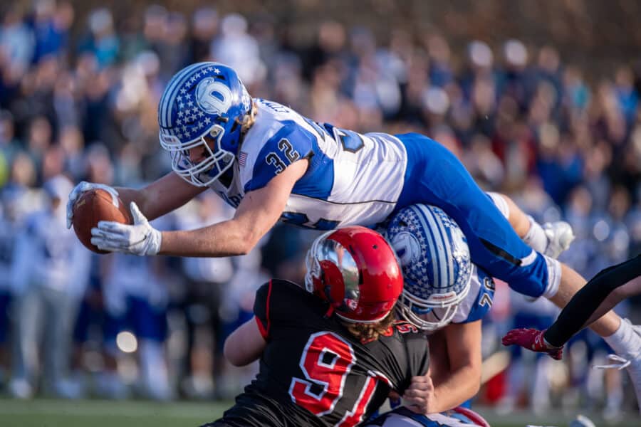 Darien RB Tighe Cummiskey goes over the top for a touchdown.(David G. Whitham)