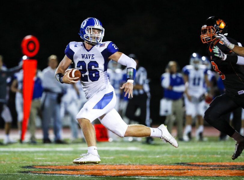 Darien’s Nick Green hauls in a pass for a big gain as Jackson Mitchell defends. Dave Ruden September 11, 2017 Leave a Comment