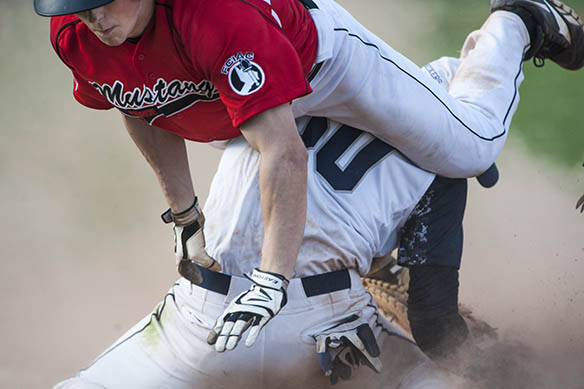 Fairfield Warde high school’s Michael Foley collides into Staples high school first baseman Ross Poulley during a CIAC second round class LL baseball tournament game played at Staples high school, Westport, CT on Tuesday, June 3rd, 2014. Foley was safe becaise the throw hit the bag.