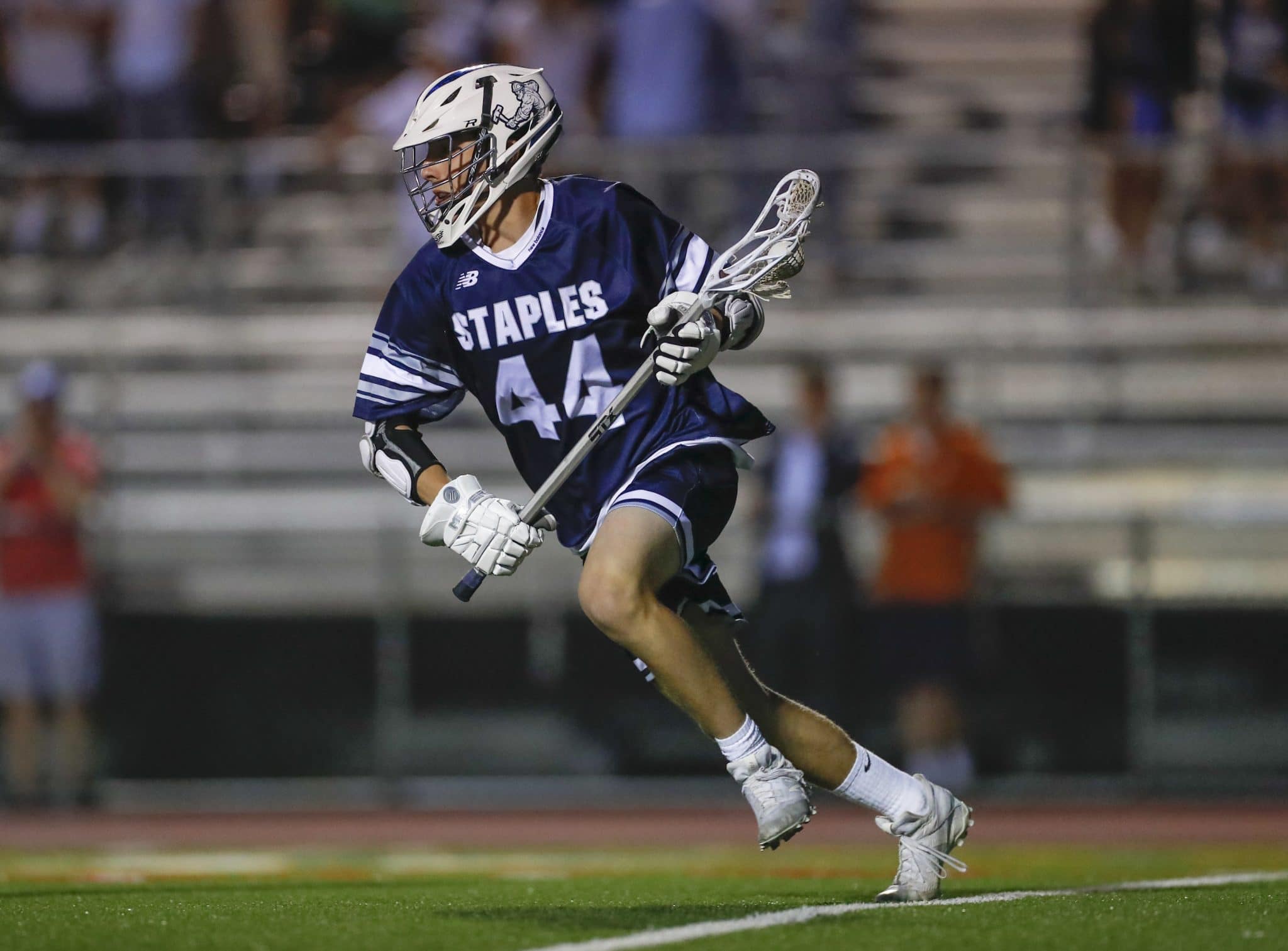 Staples Derek Sale carries the ball behind the net.