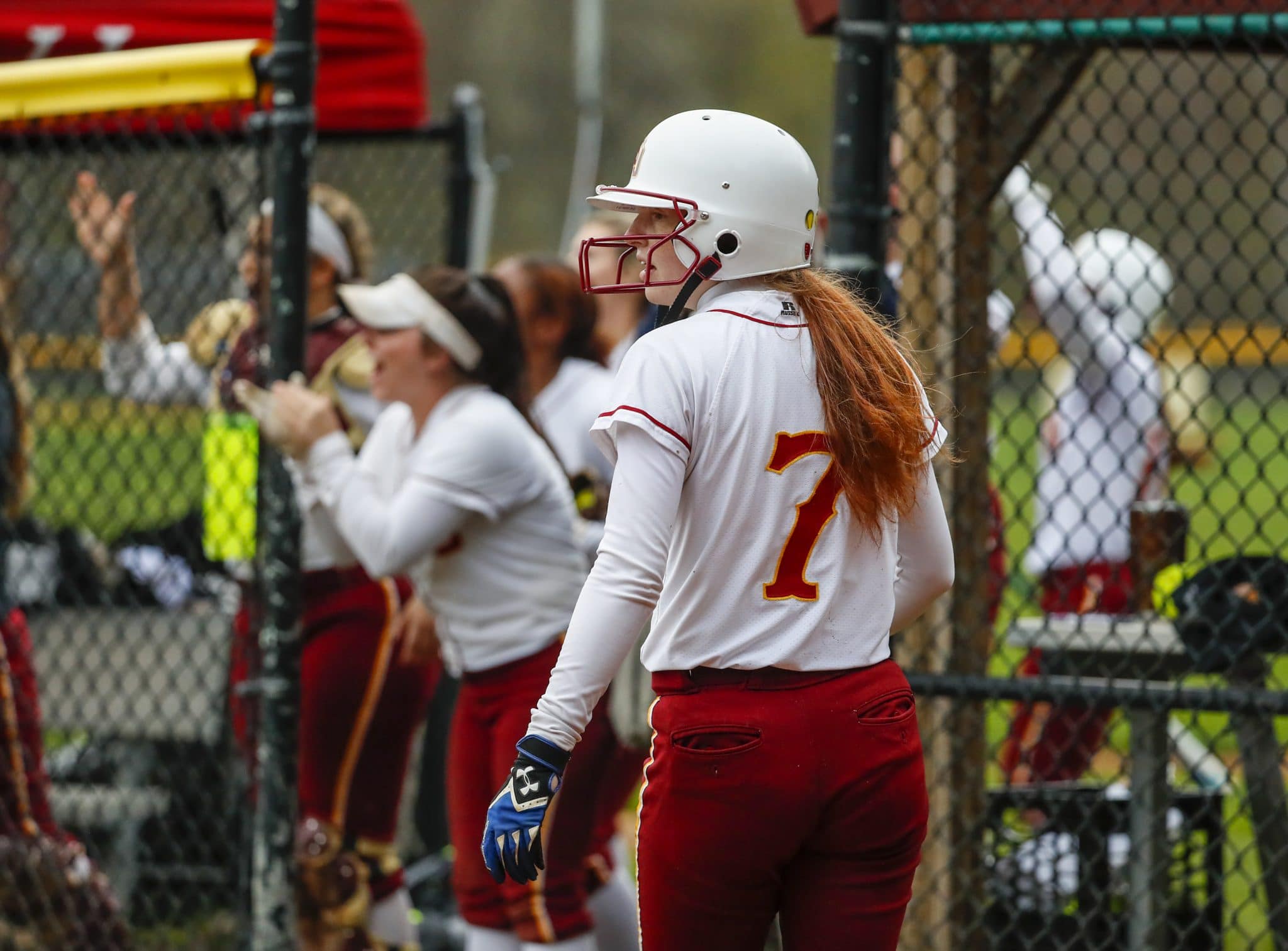 St. Joseph’s Brittany Mairano scores the Cadet’s tying run as her team cheers. Dave Ruden May 7, 2019 Leave a Comment