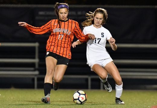 Staples’ Ava Simunovic and Ridgefield’s Tasha Riek compete to win a loose ball. Dave Ruden November 1, 2017 Leave a Comment
