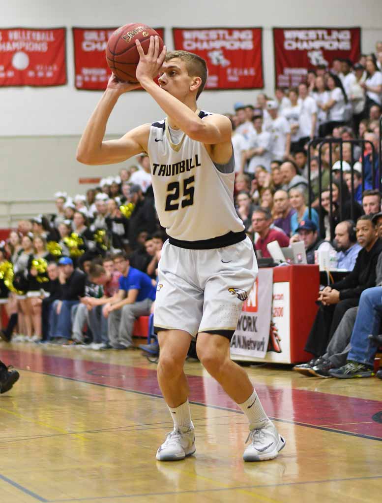 J.J. Pfohl (25) of the Trumbull Eagles takes a wide open three point shot.