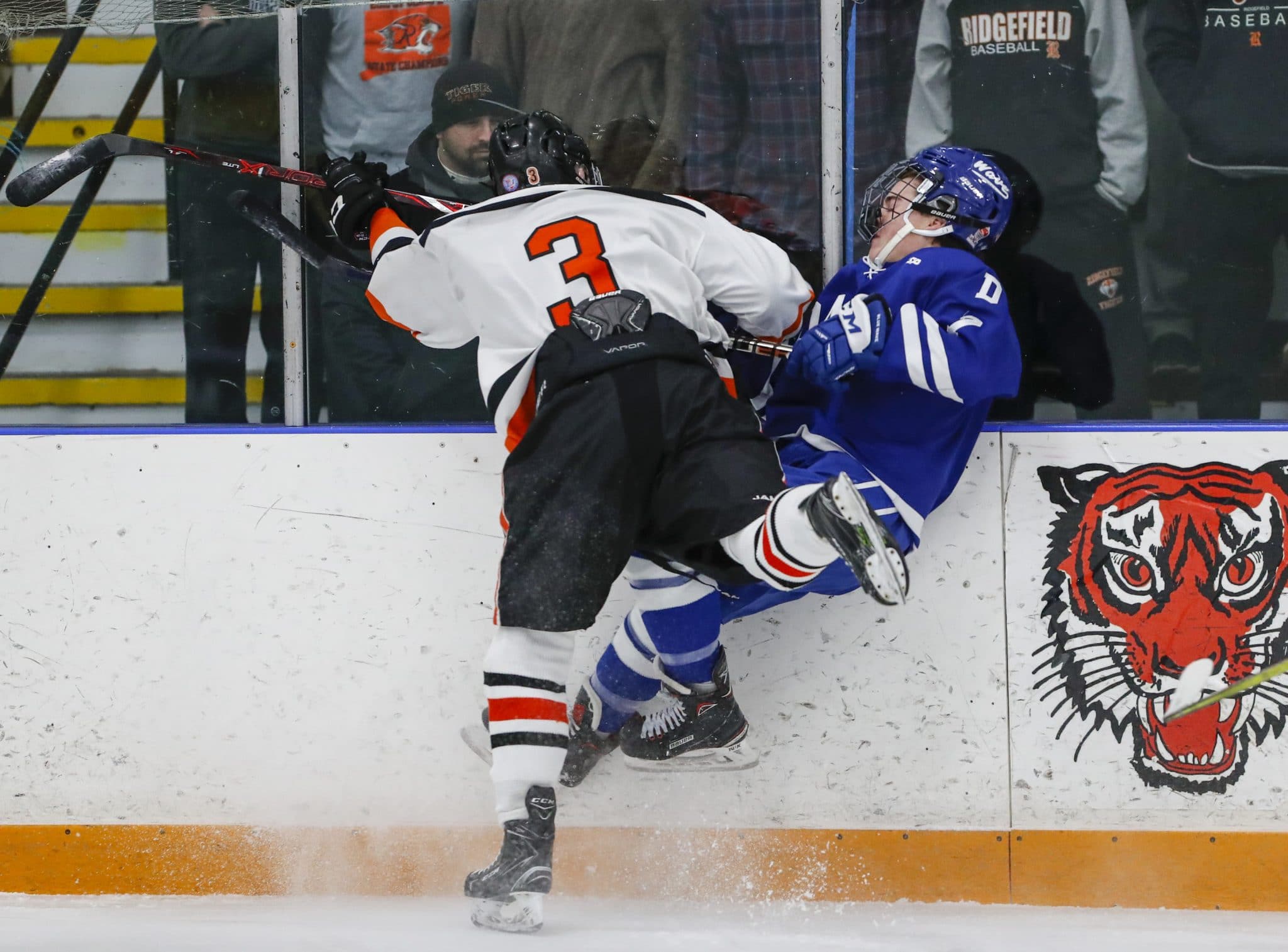 Ridgefield’s Matt Walker delivers a hit early in the game. Dave Ruden January 11, 2019 Leave a Comment
