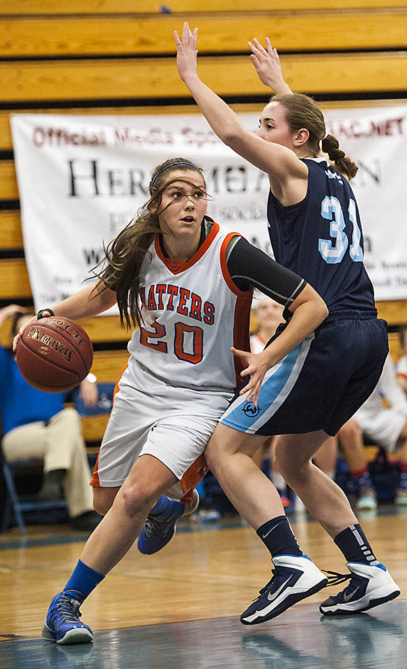 Danbury high school’s Allie Smith drives toward the basket during the FCIAC girls basketball championship game against Wilton high school played at Fairfield Ludlowe high school, Fairfield, CT on Thursday, February, 27th, 2014.