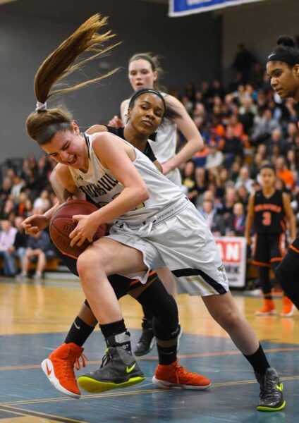 Julie Keckler (23) of the Trumbull Eagles battles for a loose ball. Dave Ruden December 8, 2017 Leave a Comment
