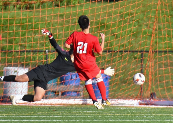 Shoki Araki of Greenwich scores on a penalty kick against Staples. Dave Ruden September 26, 2018 Leave a Comment
