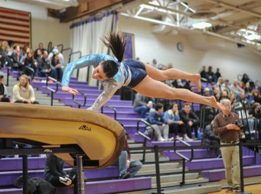 Jessica Olin of Wilton competes on the vault during the FCIAC Gymnastics Final.