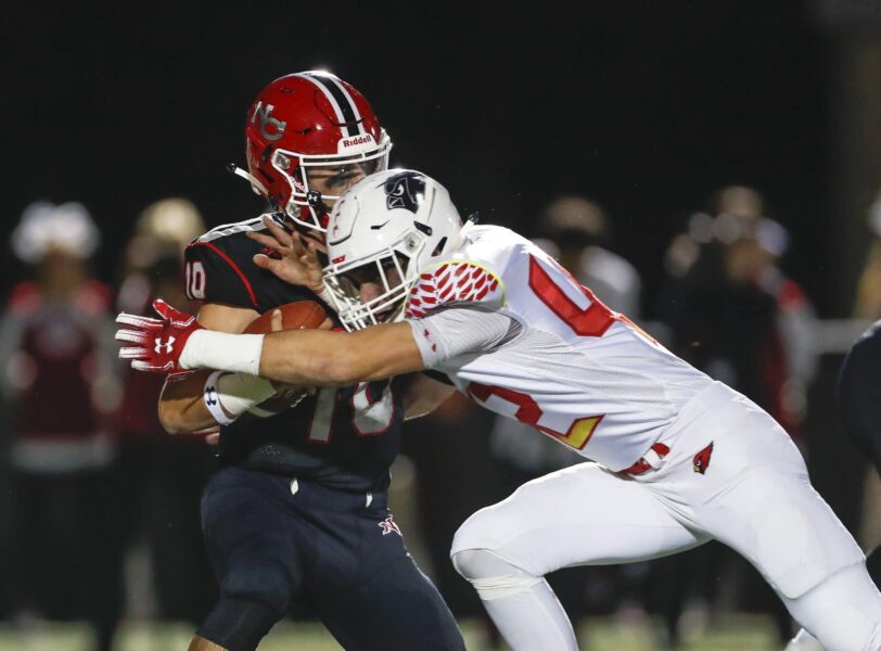 Greenwich’s Mozi Bici sacks New Canaan quarterback Drew Pyne. Dave Ruden October 6, 2018 Leave a Comment