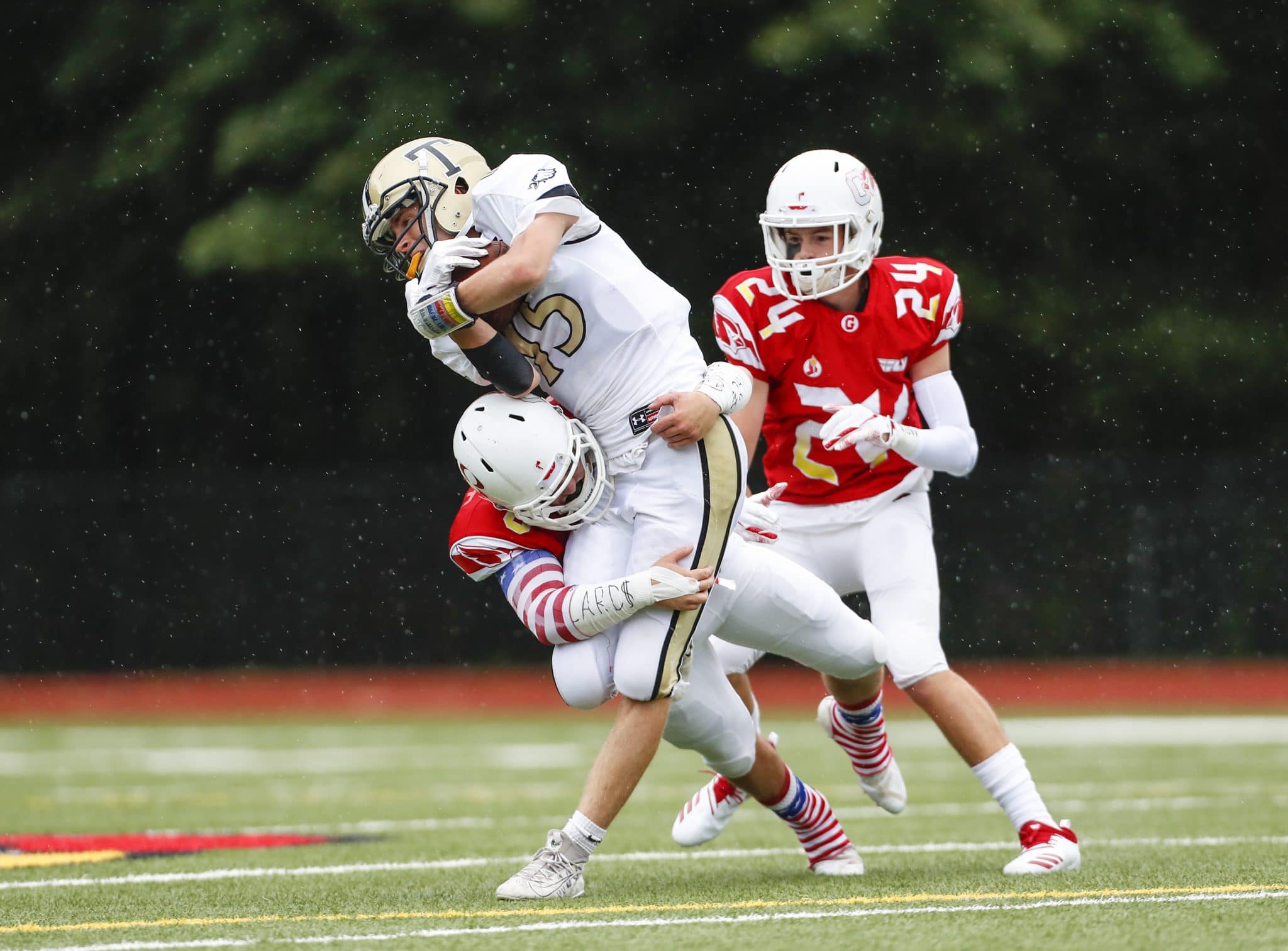 Greenwich’s Jack Feda wraps up Trumbull’s Kyle Atherton. Dave Ruden September 8, 2018 Leave a Comment