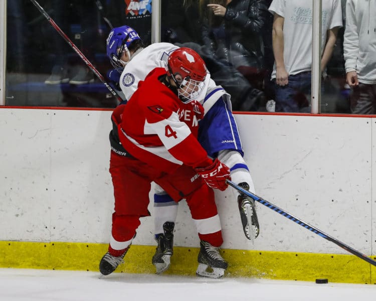 Greenwich’s Jake Shreders lays a hit on Darien’s Albert Lian. Dave Ruden January 13, 2020 Leave a Comment