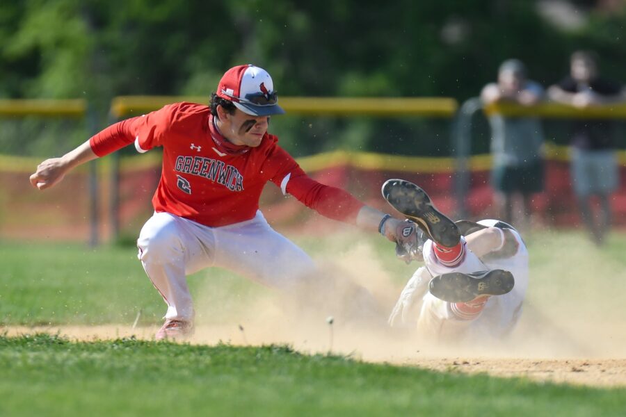 Christian Mingione of Greenwich puts a tag on Fairfield Wardes’ Griffin Polley. Dave Ruden May 19, 2021 Leave a Comment