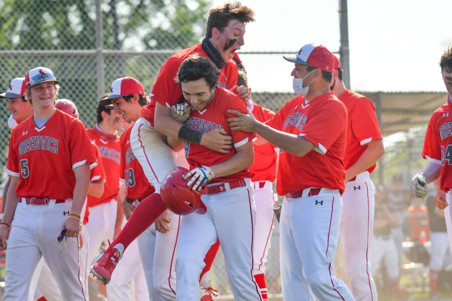 Justin Zych is mobbed at home plate after smashing a 3 run homer.