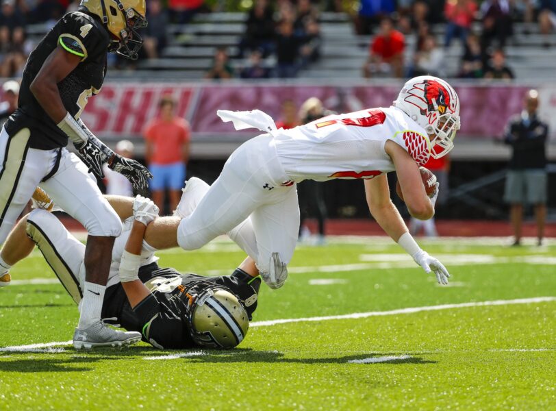 Greenwich’s Henry Saleeby is tackled by Trumbull’s Justin Beaudry. Dave Ruden September 9, 2017 Leave a Comment