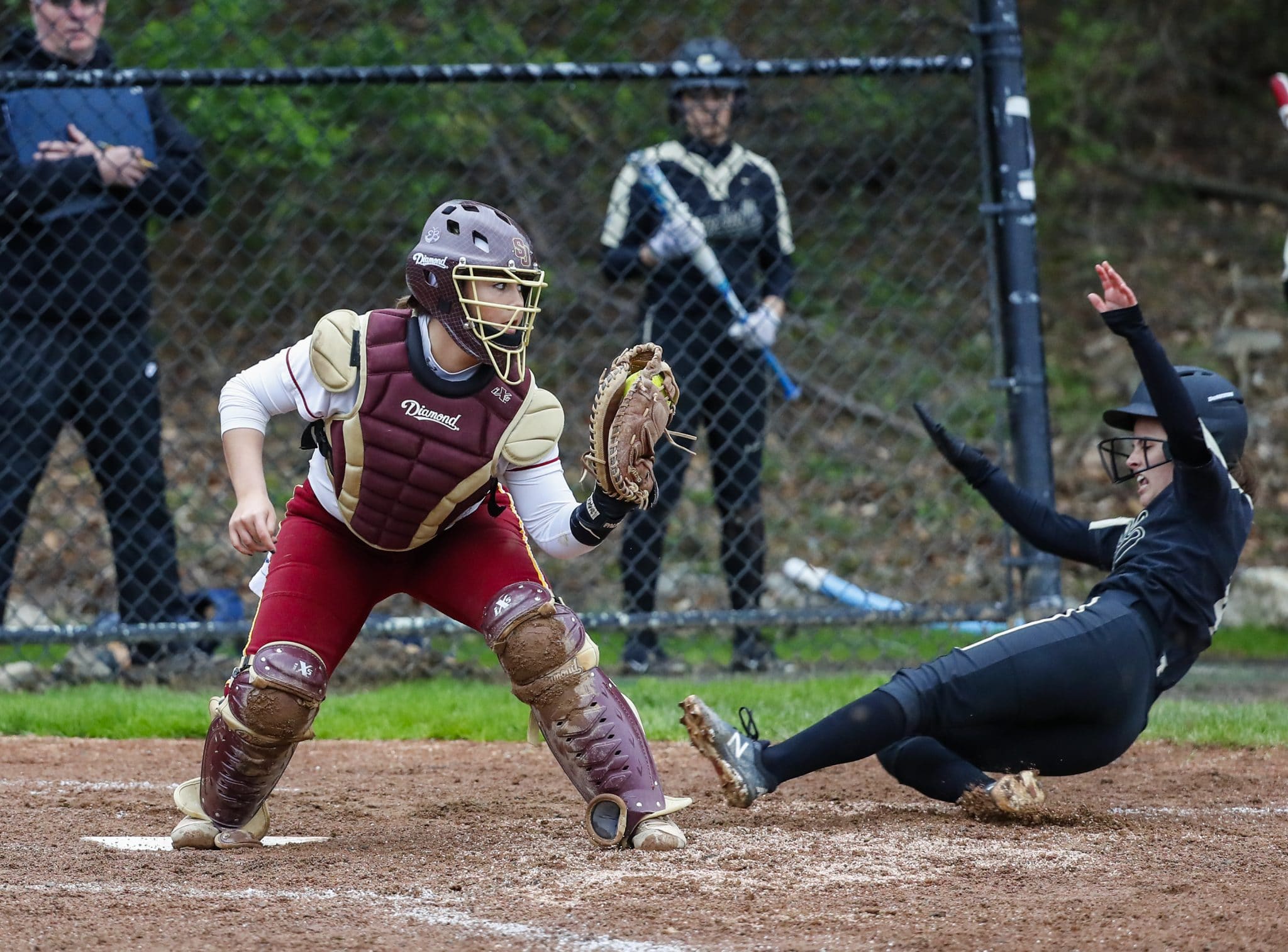 St. Joseph’s catcher Charlee Horton gets a bases loaded force out at home.