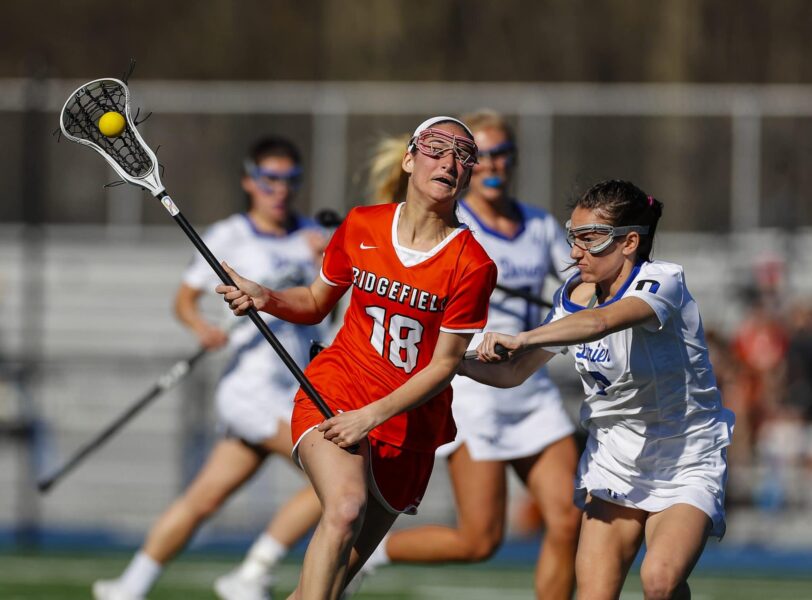 Darien’s Kate Bellissimo defends against Ridgefield’s Aly Gagnon. Dave Ruden April 16, 2019 Leave a Comment