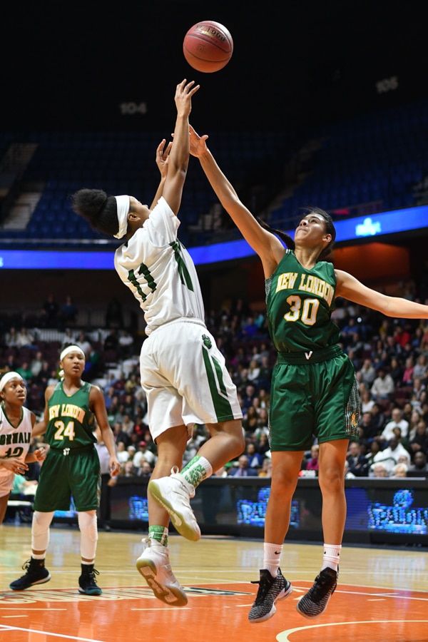 Norwalk’s Anaijah Morgan shoots over Tania Pagan of New London. Dave Ruden March 16, 2019 Leave a Comment
