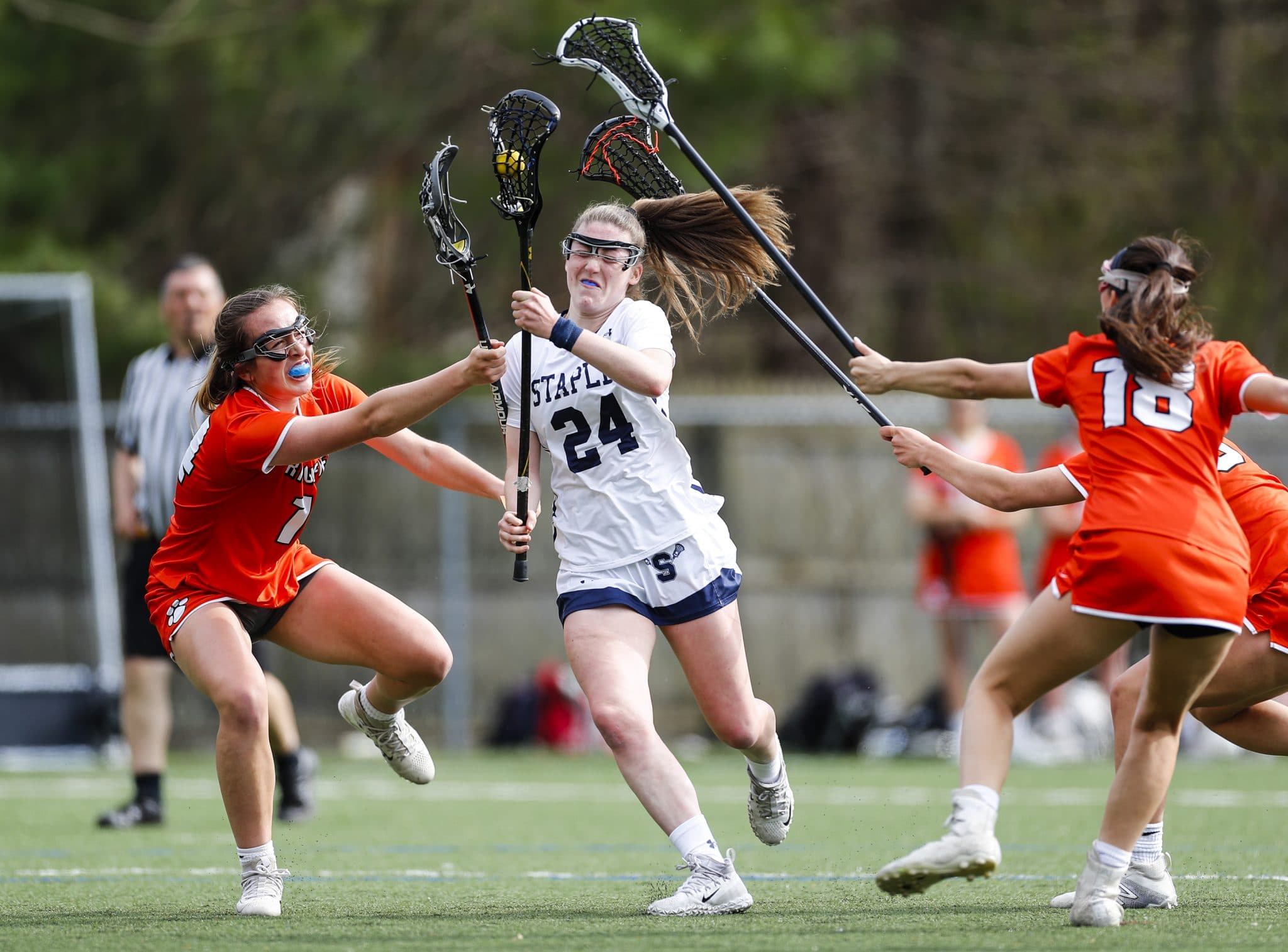 Staples’ Kyle Kirby is defended by a trio of Ridgefield defenders. Dave Ruden April 25, 2019 Leave a Comment