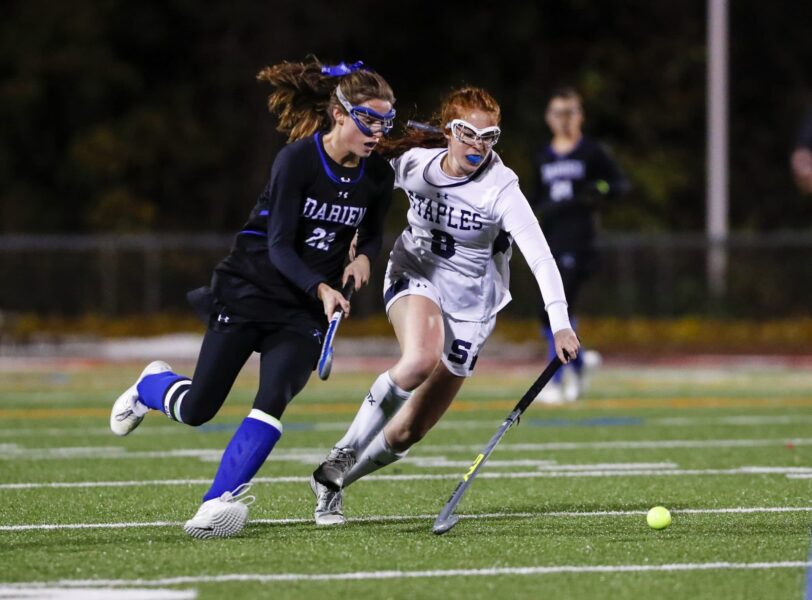 Darien’s Katie Elders battles Staples’s Ella Bloomingdale for the ball.