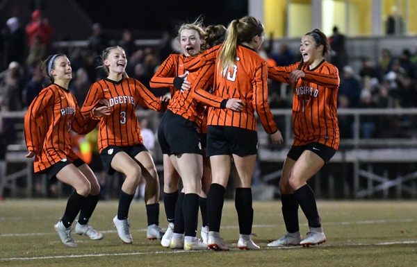 Ridgefield celebrates a goal by Claire Middlebrook.